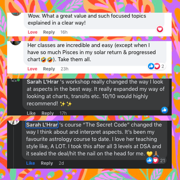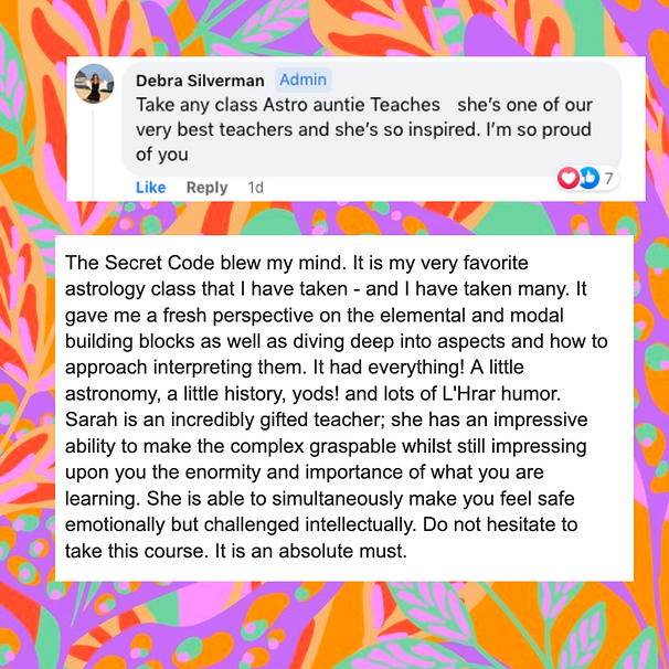 “Sarah infuses integrity, compassion, curiosity and great depth of knowledge into every astrology reading she does. Her joy for astrology, her clients and the insights a birth chart reveals is palpable. I've had the pleasure of receiving a reading from her myself and feel lucky to call her a teacher. She has this way of weaving the information in your birth chart into a thorough story that leaves you with a newfound level of self understanding”